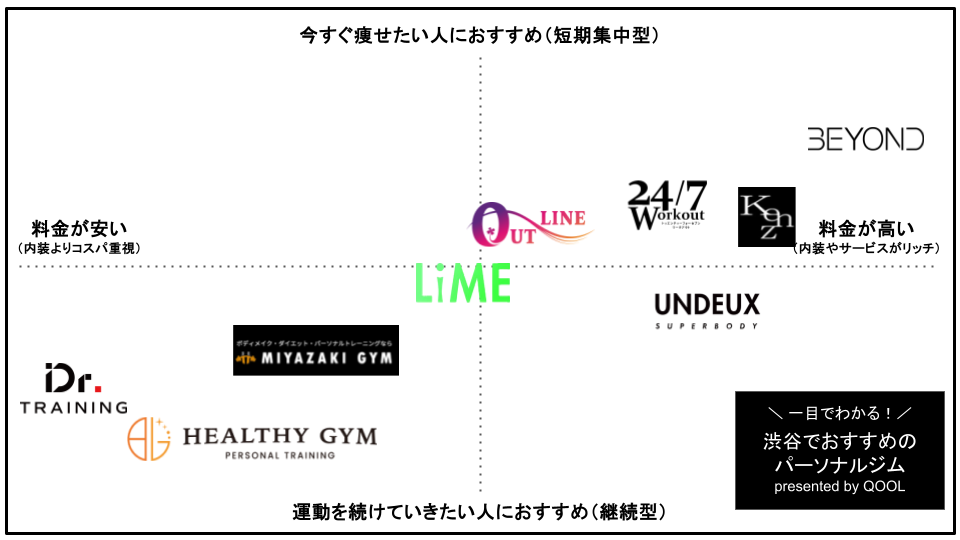 今回はそれらのジムの中から「口コミ・コスパ・店舗数・渋谷駅からの近さ」を軸に評価し、おすすめできると判断したパーソナルトレーニングジムを厳選しました。