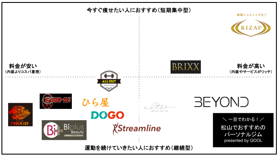 今回は松山にあるパーソナルトレーニングジムを「口コミ・コスパ・店舗規模・松山駅からの近さ」の4つを軸に徹底比較。おすすめ店舗だけを厳選しました。